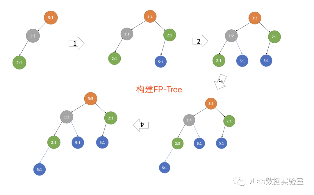 如果我们想获取谁的频繁模式,只需要找到该节点并上溯寻找到所有节点即可,举个例子,找到2的频繁项集候选集,可以得到两个个路径;根据这个FP-Tree,挖掘频繁模式就是通过递归的获取节点的子树的过程。子树构建方式如下:新建一个新的FP树,然后遍历树中所有的待挖掘节点,往上找,直到root节点,然后把当前路径上的非根节点添加到subTree中,每个节点的频次为当前遍历节点的频次。