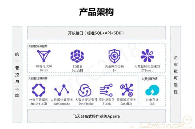 我们大数据轻量云的产品理念就是,以私用云的形态,将 MaxCompute、AnalyticDB 与 DataWorks 为代表的阿里大数据计算能力,用尽可能低的门槛输出给客户,普惠各行各业。、所以当时的产品矩阵是,底层基于飞天分布式操作系统 Apsara,然后去把大数据引擎,刚才讲的 MaxCompute、AnalyticDB 都输出去。再上面就是阿里常用的一些大数据应用,比如说 DataV 还有 BI 报表。产品架构就是这样。