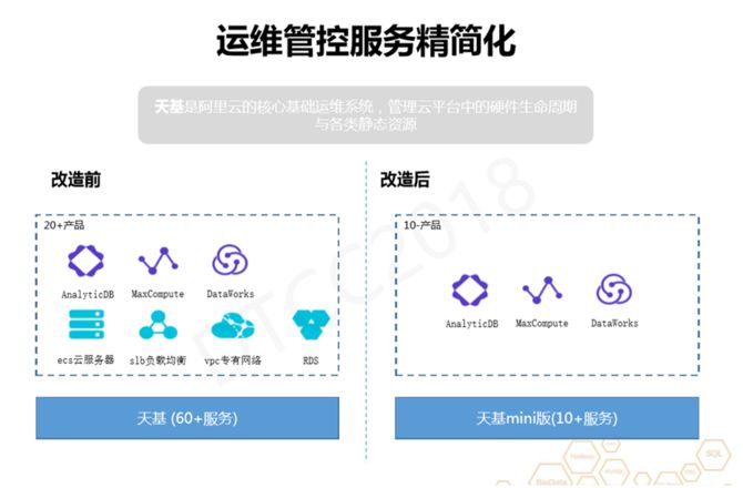 第二块是对运维管控服务做了一个极大的精简。天基是阿里云的核心基础运维系统,管理云平台中的硬件生命周期与各类静态资源。在我们的云体系中,天基上面管控了 60 多个服务,但是这个解决方案在我们轻量的方案中是不成立的。我们在轻量云里只有三个产品,AnalyticDB、MaxCompute 和 DataWorks。当时我们梳理了一遍这个整体的管控服务,还有他们互相之间的依赖关系,然后从里边认真筛选了一遍,把所有没有必要的依赖全部都砍掉了,同时也做了一些改造,最终从 60 多个服务压到了 10 个服务。然后天基的迷你版原来在公有云还有专有云中可能要 10 台服务器,压缩完以后就减少到了 3 台左右,在整体的硬件成本和规模上都节省了一倍以上。