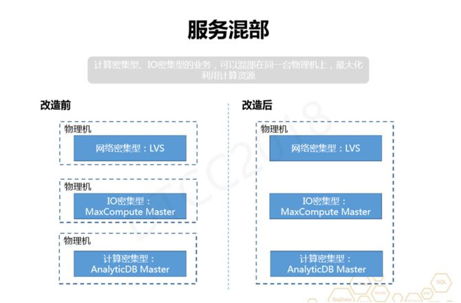 还有一个就是比较常见的套路就是服务混布,这个概念其实在业内不是特别新鲜,就是我们把计算密集型,还有网络密集型,还有没有资源竞争关系的服务尽可能的布到一个服务器上。