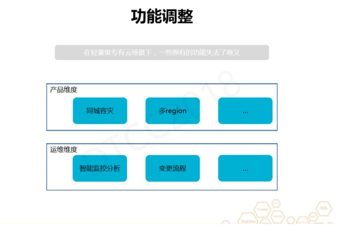 功能调整。在轻量的条件下,一些原有的功能失去了意义,因为我们只有 12 台。所以这倒是一件干得很痛快的事情,就是看哪些服务没有用的就把他全部砍掉,刚才讲到的同城同灾,多 region,还有我们之前整个机群管理,因为有很多内部管理有很多变更的流程,还有很多智能监控分析我们都砍掉了。智能监控分析这一块我说一下,大家知道这个智能往往都是基于数据的,如果你的集群量非常大的时候,能产生大量数据的时候,这个智能是有意义的,但是当机群只有 10 台或者 20 台的时候,这个时候去搞基于数据化的智能运维也是没有太大的价值。所以当时也是梳理了一番,把很多的业务都砍掉了。