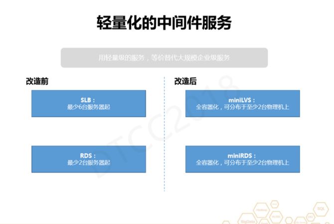轻量化的中间件服务。SLB 当时物理机是 6 台,RDS 当时也是基于物理机去部署的,最少要两台服务器。在轻量的场景中,我们去找 miniLVS 或者 miniRDS 这种非常小巧的服务去替代原来庞大的物理机,在这个场景下我们节省了十多台服务器。