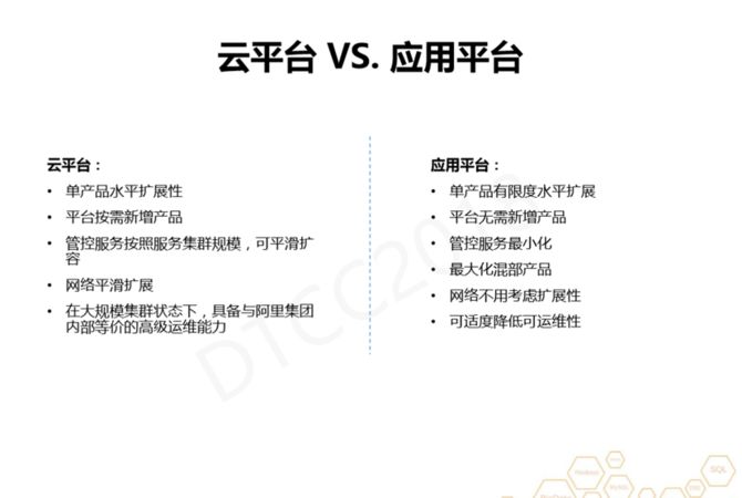 最近我们也有一些思考,这个思考更多的是偏这种业务方面的。因为我们当前讲到的东西都是一个云平台的,但其实前方传来更多的需求是偏应用平台的,应用平台跟我们做的这个平台比较大的一个差别,如下: