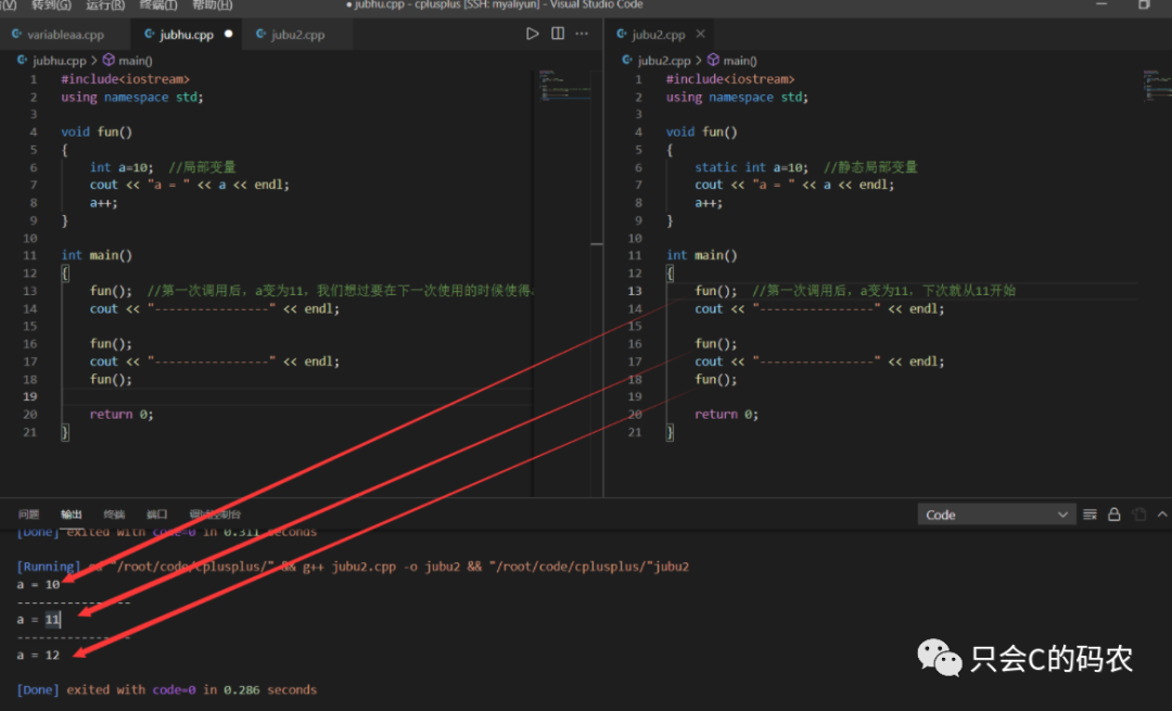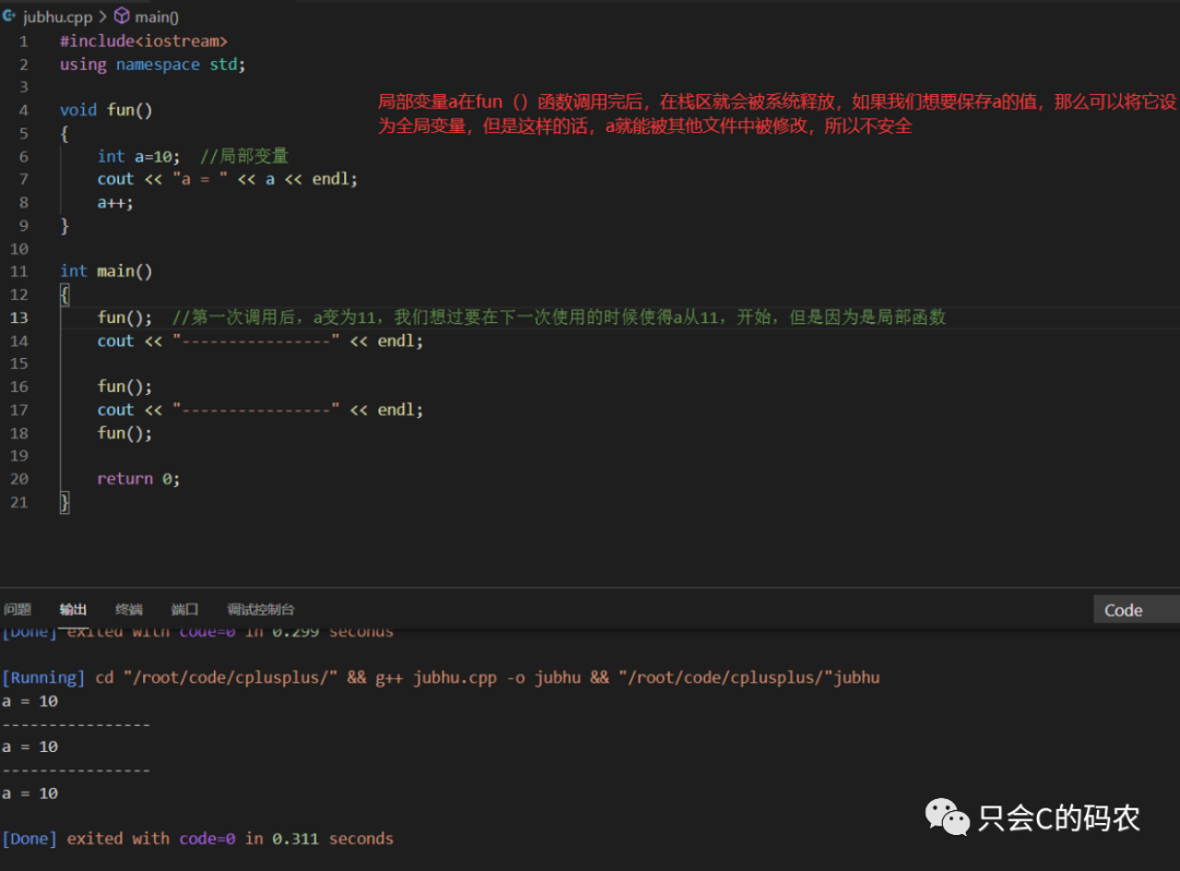 因为第一次调用fun()函数后,最后实现了++,所以a的值变为11,然后下一次fun()调用就输出11,然后再++,第三次调用之后变为12.