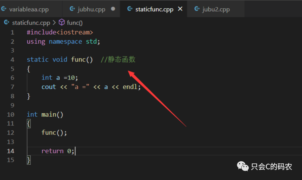 在函数的返回类型前加上static关键字,函数即被定义为静态函数。静态函数与普通函数不同,它只能在声明它的文件当中可见,不能被其它文件使用。