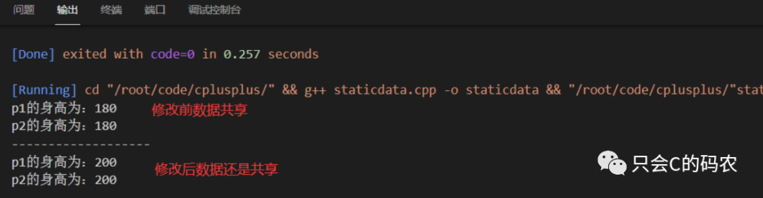 #include<iostream>using namespace std;class Person{private:static int age; //静态成员变量,私有变量,类内生明public:static int height; //静态成员变量,公共变量,类内声明};//类外初始化int Person::height =180;int Person::age =20;void test01(){Person p1;cout << "p1的身高为:" << p1.height <<endl;Person p2;cout << "p2的身高为:" << p2.height <<endl;//修改p1.height = 200;cout << "-------------------" <<endl;cout << "p1的身高为:" << p1.height <<endl;cout << "p2的身高为:" << p2.height <<endl;}int main(){test01();return 0;}