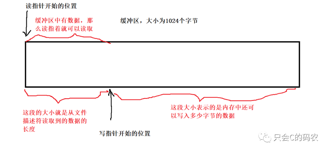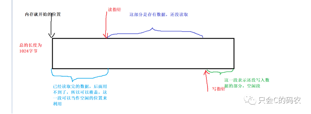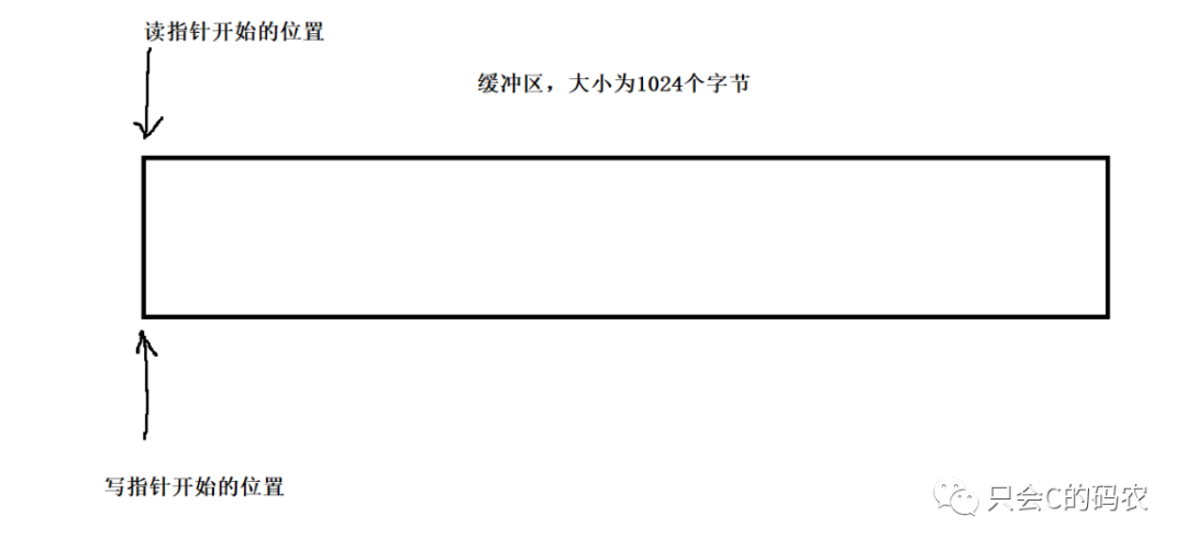 首先我们再内存中创建一个缓冲区,缓冲区的大小为1024字节,同时定义两个指针,一个读指针,表示的是可以读取的数据的开始位置,一个写指针表示的是可以写入数据的起始位置,开始的时候两根指针都是指向内存开始的地方,如下图所示: