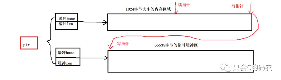 因为数据的处理只能放到固定大小的缓冲中进行处理,即上述的1024字节的缓冲中,那么如果很多数据都读取到这块区域的话,那么肯定是放不下的,我们就可以利用一个临时的缓冲区,把放不下的数据先放到临时的缓冲的位置,等到1024字节大小的内存有剩余的空间的时候我再将临时缓冲区的数据放入到1024的位置进行处理,那么何时1024缓冲中有空闲的位置呢?原理及实现如下图所示: