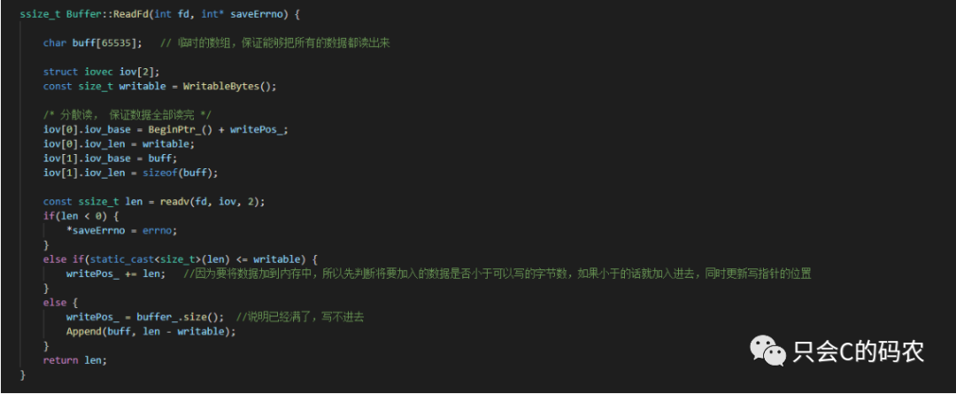 因为缓冲区的大小是固定的大小,而我们通常是一次性将数据全部读取到缓冲区,那么就有可能装不下数据,所以需要临时创建一个缓冲区来缓解,将存不下的放到临时缓冲区,这样就可以一次性将所有的数据读入,这里利用临时缓冲区的技术是一个分散读的技术,即将数据分散读取到内存中不同的位置,分散读的话需要定义一个结构体数组如下所示: