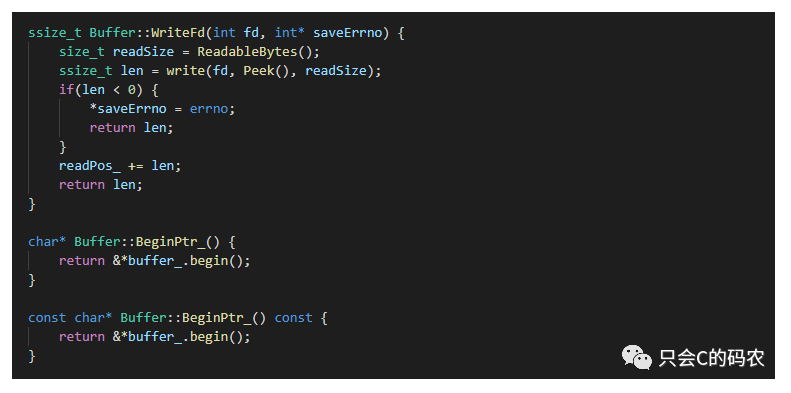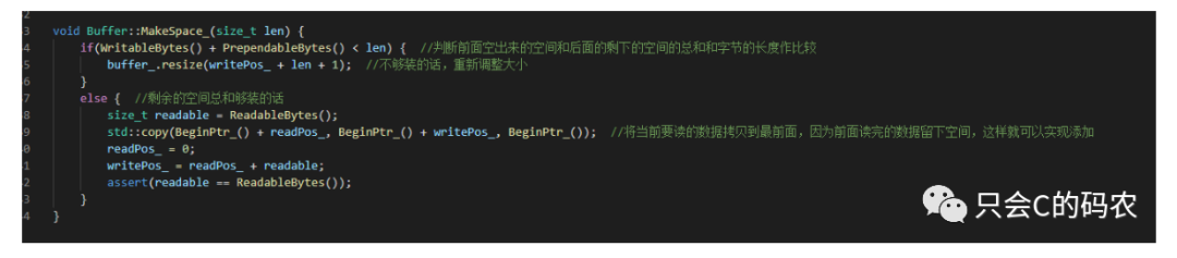 可以从上图看出,如果我们想要写入数据,那么此时可以利用的空间就是最前面的部分和最后面的部分的位置,但是写入数据一定要连续,所以唯一的办法就是将中间的数据移动到最前面,这样就可以将空闲的区域连接在一起,方便后面的写数据。具体的实现就是将读指针到写指针之间的数据复制到最前面,再更改读指针和写指针的位置,这就是利用一个缓冲实现自动增长的原理,关键部分的代码如下: