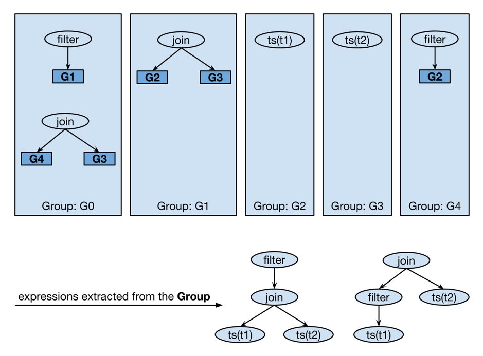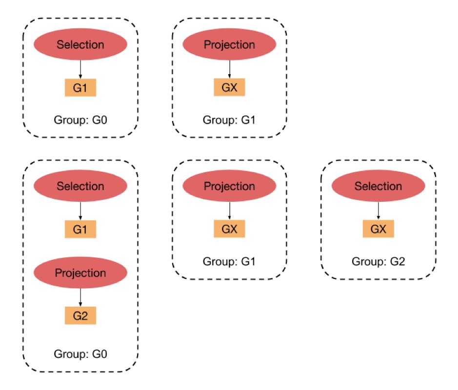 Expression:原论文中,Expression 用来指代包括 Plan 节点(也就是大家常说的的 SQL 算子)以及各种函数表达式(例如 MySQL 支持的 200 多个内置函数)在内的所有表达式。在 TiDB 现有框架实现中,只将 Plan 节点视作 Expression。Expression 大多会包含子节点,但每个子节点并不是一个 Expression ,而是一组等价的 Expression 集合,也就是接下来要介绍的 Group。 Group:表示等价 Expression 的集合,即同一个 Group 中的 Expression 在逻辑上等价。Expression 的每个子节点都是以一个 Group 表示的。在下文图例中,Group G0