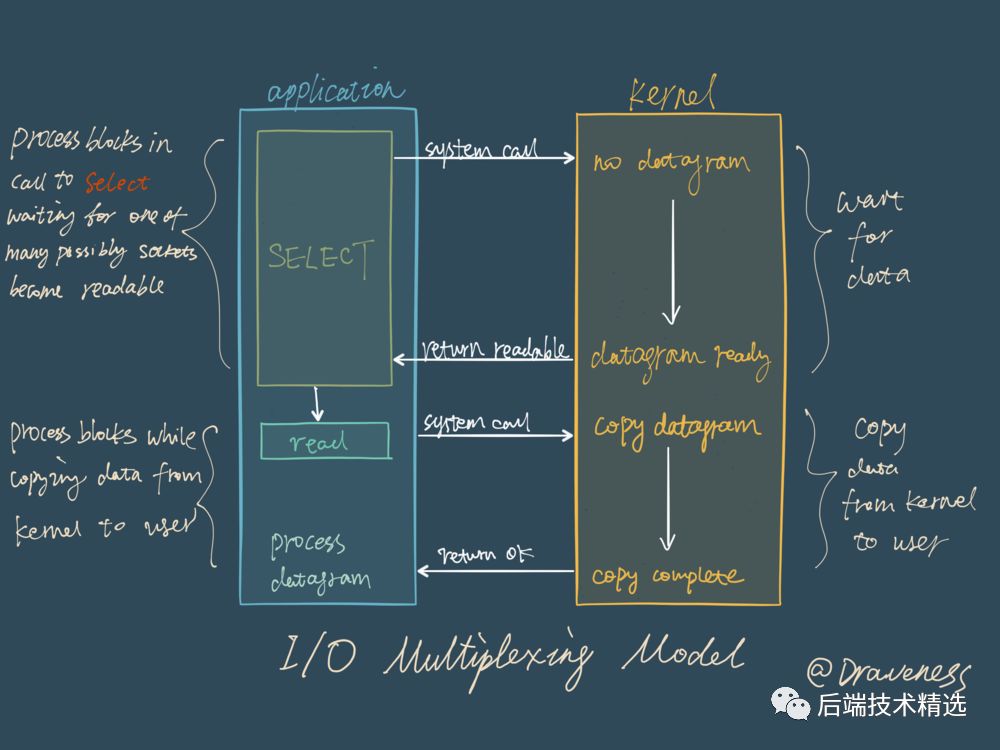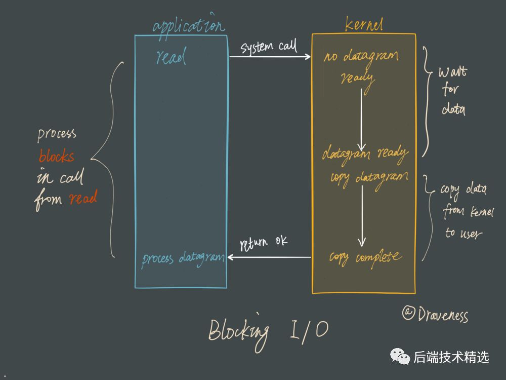 在这之前先要说一下传统的阻塞I/O是如何工作的:当使用read或者write对某一文件描述符(File Descriptor FD)进行读写的时候,如果数据没有收到,那么该线程会被挂起,直到收到数据。阻塞模型虽然易于理解,但是在需要处理多个客户端任务的时候,不会使用阻塞模型。