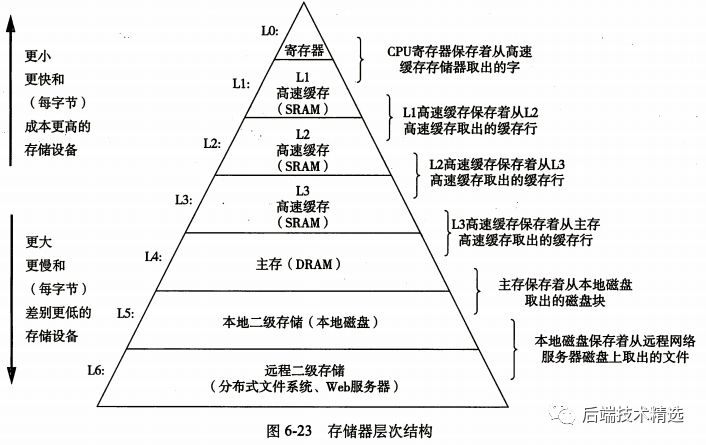 借了一张《深入理解计算机系统》的图,展示了一个典型的存储器层次结构,在L0层,CPU可以在一个时钟周期访问到,基于SRAM的高速缓存存续期,可以在几个CPU时钟周期访问到,然后是基于DRAM的主存,可以在几十到几百个时钟周期访问到他们。