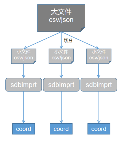 在导入数据时,使用 --insertnum(-n) 参数,可以实现批量导入,减少数据发送时的网络交互的次数,从而加快数据导入速度。取值范围为1~100000,默认值为100。指定导入连接数(每个连接一个线程),从而实现多线程导入。sdbimprt 在导入数据时支持多线程并发导入,但读数据时是单线程读取,随着导入线程数的增加,数据读取就成为了性能瓶颈。这种情况下,可以将一个大的数据文件切分成若干个小文件,然后每个小文件对应启动一个 sdbimprt 进程并发导入,从而提升导入性能。如果集群内有多个协调节点,分布在不同的机器上,那么可以在多台机器上分别启动 sdbimprt 进程,并且每个 sdbimprt 连接机器本地的协调节点,这样数据发送给协调节点时避免了网络传输(如图2)。图2