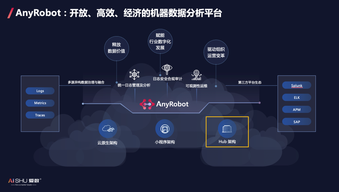 爱数AnyRobot,作为爱数大数据基础设施的核心产品之一,秉承 “平台+生态”的商业模式,打造“开放、高效、经济”的机器数据平台,创新推出开放的Hub架构,融合日志、链路和指标数据,整合多个机器数据平台和应用平台,提升机器数据的价值获取效率,帮助企业建立IT运营的可观测性,驱动组织运营变革。
