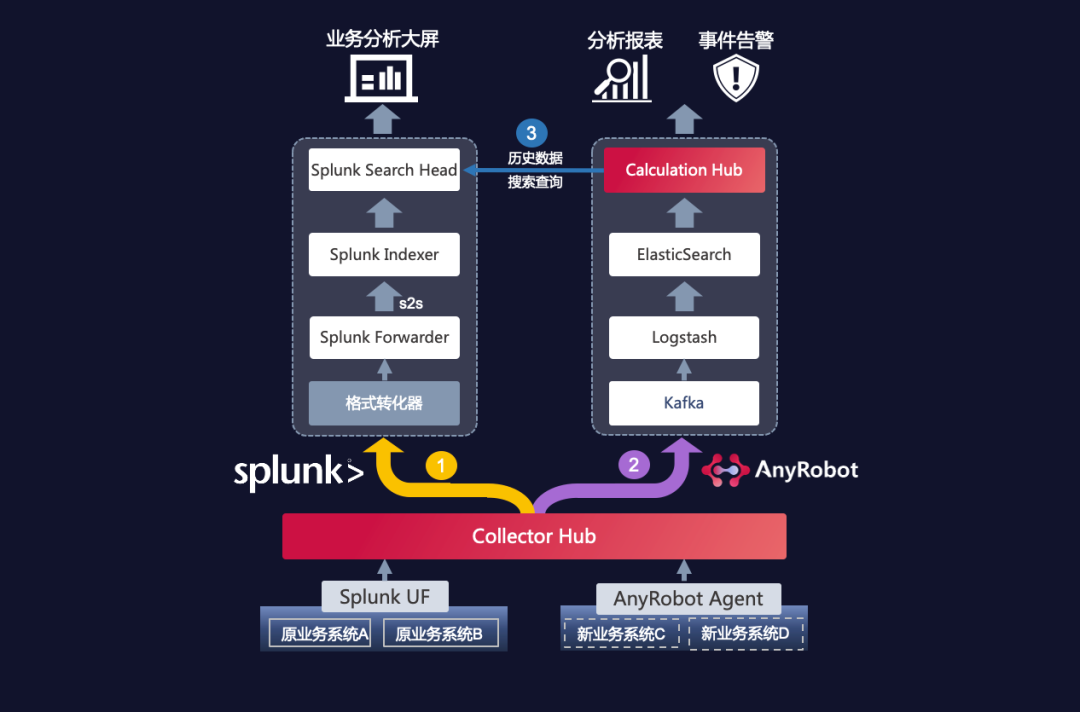 AnyRobot Hub架构可满足客户现有Splunk平台内的历史数据、新增数据和现有数据在AnyRobot平台上进行查询、分析和使用,保障客户原有数据分析业务的稳定进行。