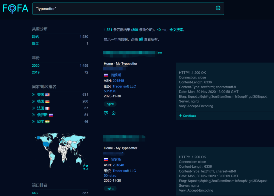 Typesetter CMS 5.x-5.1版本中,可以在后台上传模块通过上传包含php的zip文件绕过后缀白名单,执行任意php代码并获取目标权限。漏洞形成原因主要是typesetter管理后台支持zip解压,而zip后缀又在上传白名单中,因此导致任意文件上传。官方给出的漏洞详情介绍请参考:https://github.com/Typesetter/Typesetter/issues/674。下面是利用Fofa搜索该漏洞影响范围。