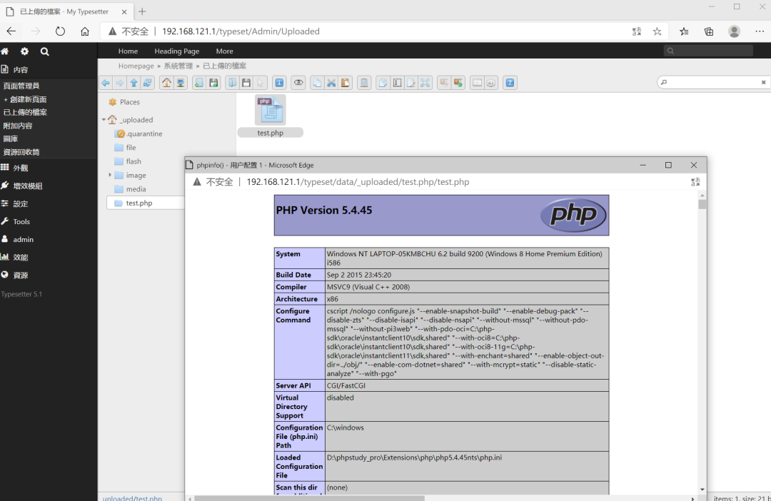 将源码下载后解压在web目录下,漏洞位于/admin/uploaded,将php文件生成压缩文件且后缀为.php.zip,右键上传解压该zip文件,打开后即可获得php文件地址。
