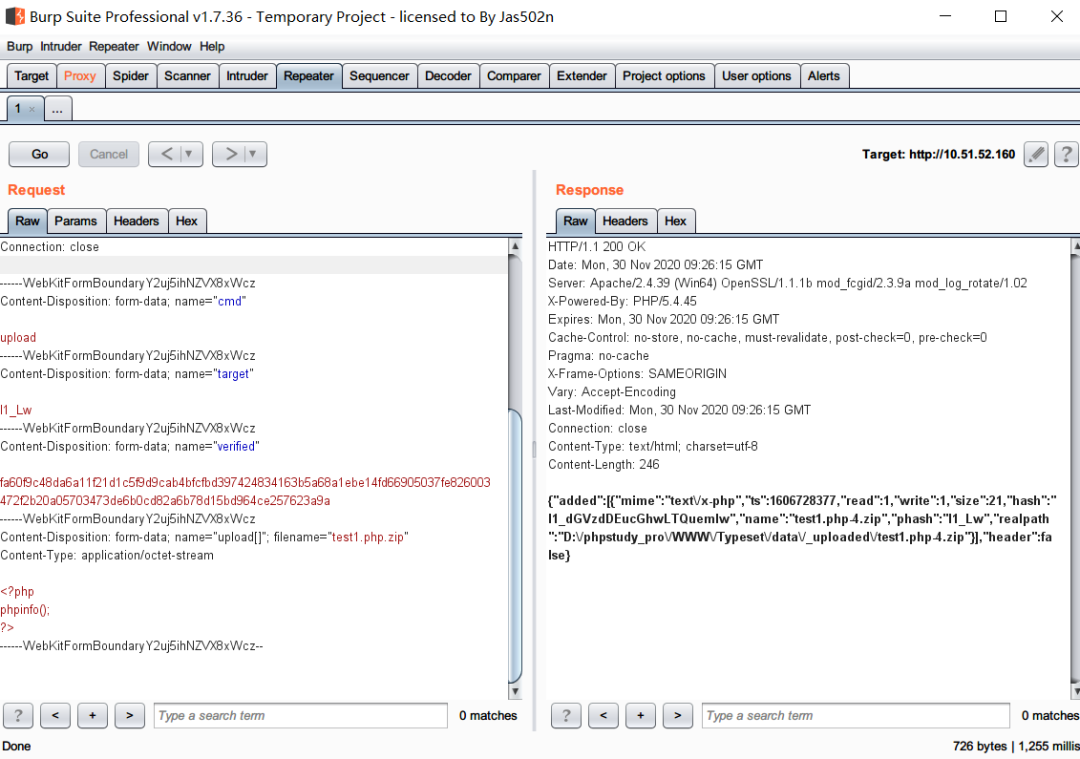 upload函数就是标准的上传行为,至此上传已完成,最后将结果存入$data数据以json格式输出,我们在上面的burp返回包中就可以看到$data中的内容。