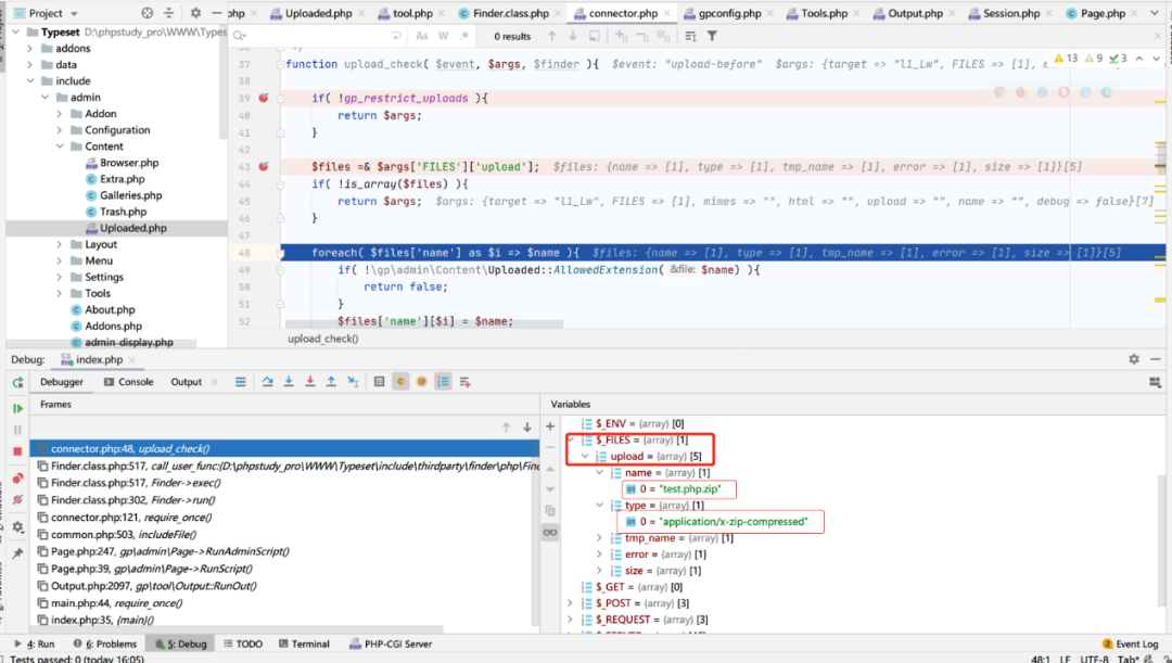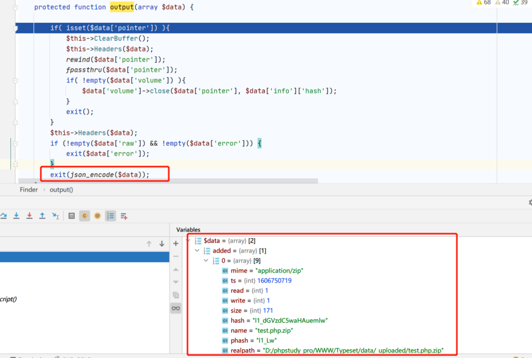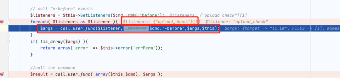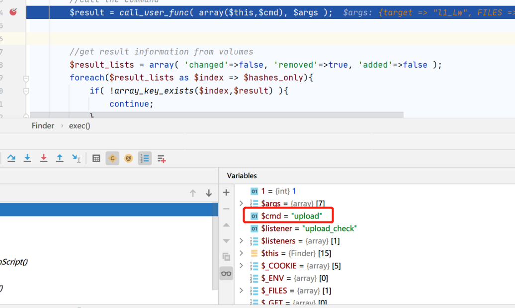 打开上传接口类Finder源码调试,在浏览器上传test.php.zip文件,在phpstrom调试查看,重点代码是这一段,$listeners的值是upload_check赋给$listener并且通过call_user_func函数调用upload_check函数,下面我们需要去看upload_check函数。
