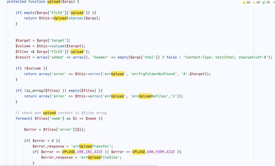 但如果我们不让他们进入AllowedExtension去判断后缀,是不是就可以绕过?那么就涉及到上面的代码,如果$file不为数组则return那么就结束了整个函数,就不会进入AllowedExtension,可是后面的调试过程中发现,若$file不为数组那么在最后的上传过程中,无法获取文件名和类型来发包给服务器,也没法完成上传动作,所以无法利用。