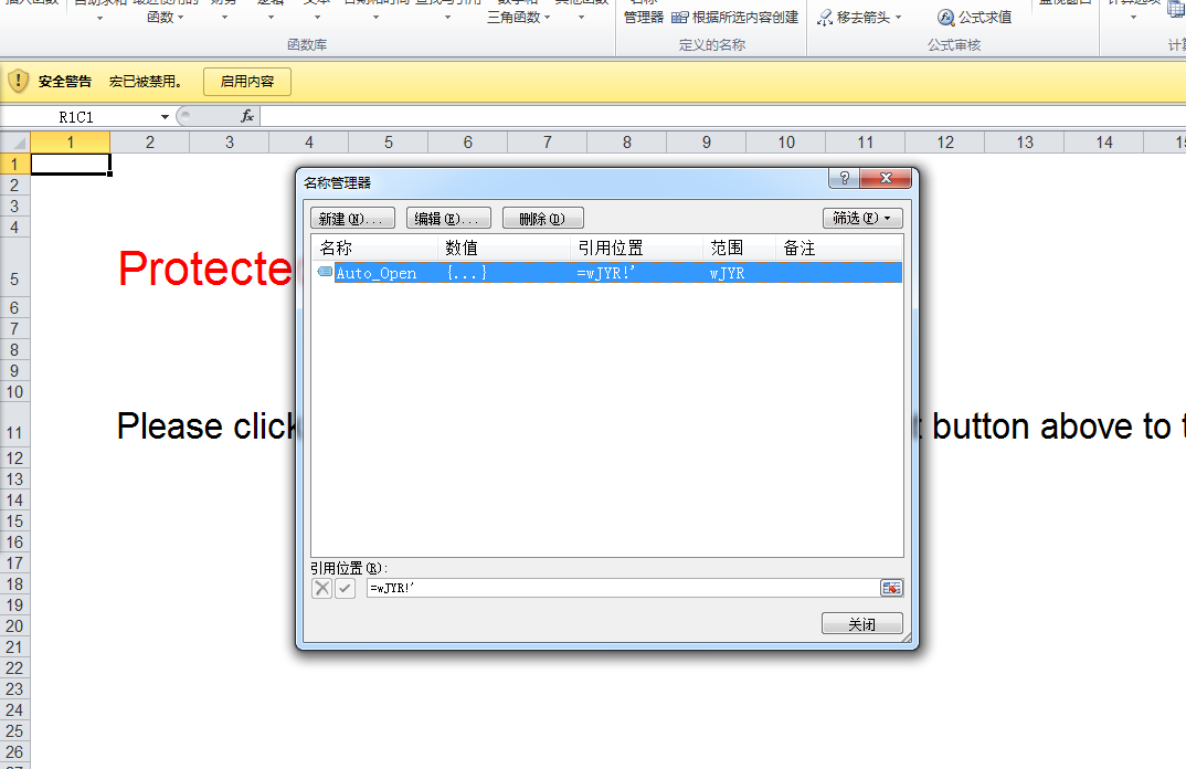 Office文档在加密后,文件结构会发生改变。如果利用默认密码“VelvetSweatshop”加密excel文档,则不需要输入密码也可以正常打开。用户在使用这种方式生成的样本时不会感受到差异,但是对样本进行静态检测时需要先通过默认密码解密出原始样本,才能检测到其中的恶意特征。这种反检测技术在2019年逐渐被各安全厂商攻克,已不再具有高强度的免杀效果。接下来通过对样本的分析来探索这种新的利用方式。打开样本后有宏的提示,并且名称管理器中可以找到自启动相关的Auto_Open内置函数,vba工程编辑器中也不包含任何宏代码。因此推测样本中使用了excel 4.0宏。