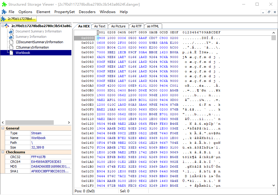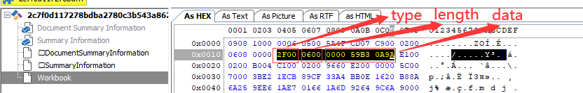 同时在样本中不包含EncryptionInfo与EncryptedPackage流,而是标准的xls文件结构。因此这是一个早期版本(excel 2003及更早的版本)中生成的加密文档,只对workbook流中的部分数据进行了加密。
