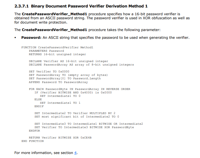 异或加密的秘钥验证代码如下(MS-OFFCRYPTO 2.3.7.1 Binary DocumentPassword Verifier Derivation Method 1):