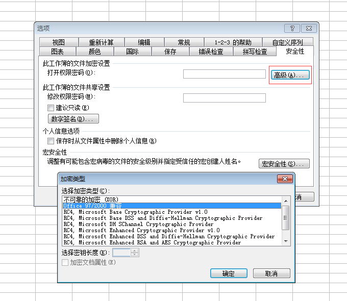 使用默认密码“VelvetSweatshop”带入计算后得到的值为0x9A0A,与样本中保存的verificationBytes相同,由此可以确定样本通过默认密码进行加密。在Office 2003中可以在加密时选择加密类型为不可靠的加密(XOR),从而构造出同样的样本。