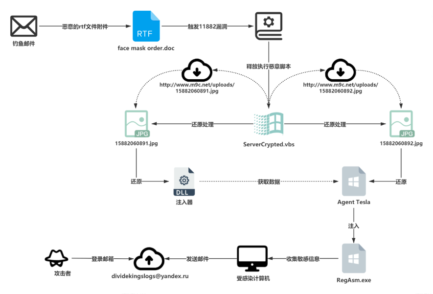 攻击载荷是伪装为口罩订单的RTF文档,作为商业买卖主题发送钓鱼邮件的附件到达。RTF文档打开后会触发CVE-2017-11882漏洞,通过恶意代码执行恶意脚本,脚本中的代码会下载第二阶段载荷,最终将Agent Tesla注入到合法的进程“RegAsm.exe”中。其攻击流程如下所示: