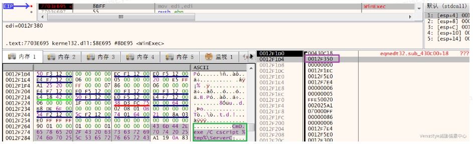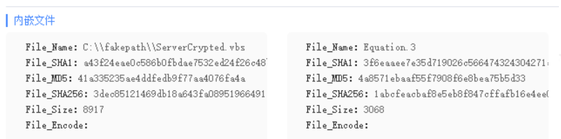初始载荷利用了CVE-2017-11882漏洞启动攻击流程,使用shellcode执行释放的vbs脚本(CmD.exe/C cscript %tmp%\ServerCrypted.vbs)。