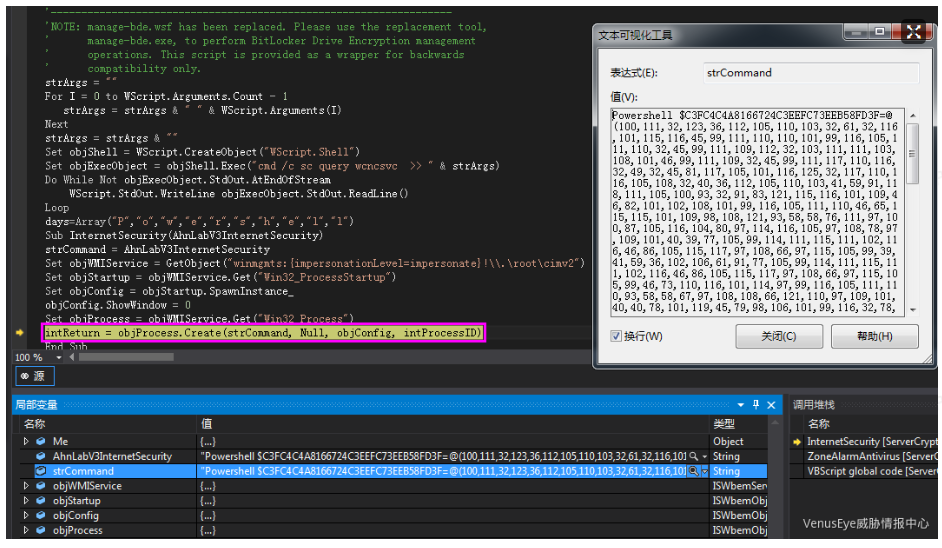 ServerCrypted.vbs是经过混淆处理的脚本文件,其中包含反转和混淆处理的PowerShell代码,将其解混淆还原后加载到内存中后作为命令代码执行,vbs脚本执行后最终将会通过PowerShell执行被混淆的代码: