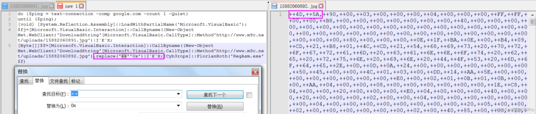 可以看出这段PowerShell主要为下载经过混淆处理的PE文件“http://www.m9c.net/uploads/15882060892.jpg”和混淆编码处理过的注入器“http://www.m9c.net/uploads/15882060891.jpg”,下载后将其处理后执行,最终“15882060891.jpg”将“15882060892.jpg”注入到“RegAsm.exe”中。“[Cyb3rops]::FlorianRoth('RegAsm.exe'$f))”中传递的参数为被注入的进程名和注入的代码: