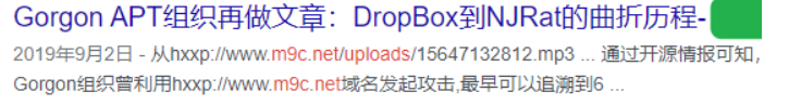 “m9c.net”以及“m9c.net/uploads”在Gorgon以往的攻击中使用到,并且Payload都是相似的格式,伪装为jpg图片文件(或mp3音频文件)的URL“m9c.net/uploads/15(^[0-9]{8}$)1.jpg”: