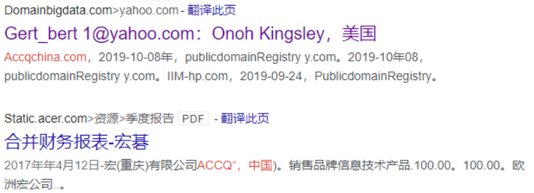 “gert_bert1@yahoo.com”注册的一域名“accqchina.com”,与宏碁公司中国重庆分公司的缩写有极高相似性: