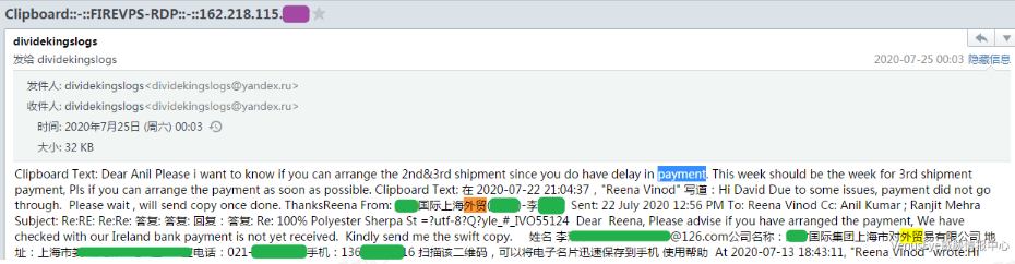 并在收件箱里发现中国受害者,为上海一外贸公司的销售经理,邮件中包含多个商业交易的沟通,不乏转账信息: