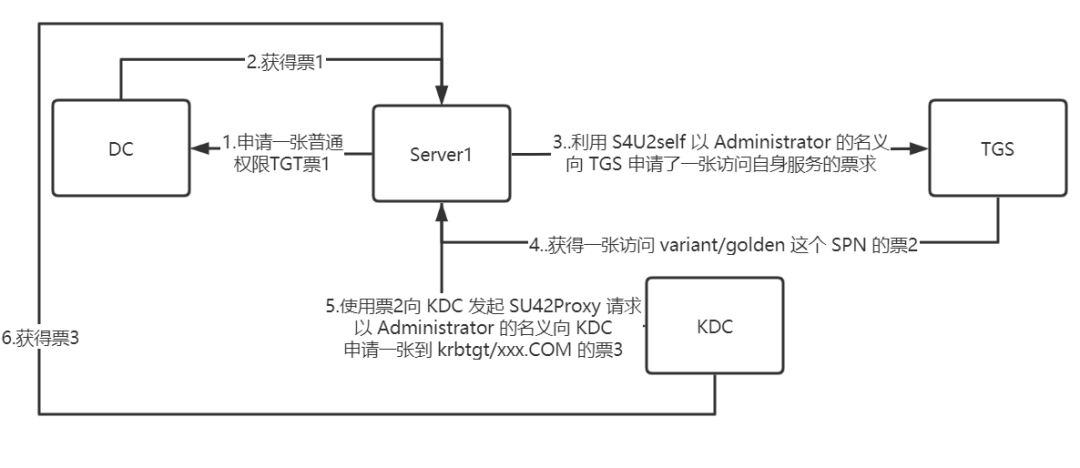 1. 申请一张普通的TGT票,需要将Server1注册成服务账号,并将其目标 SPN 是krbtgt/xxx.COM3. 利用 S4U2self 以 Administrator 的名义向 TGS 申请了一张访问自身服务的票5. 使用票2向 KDC 发起 SU42Proxy 请求,以 Administrator 的名义向 KDC 申请一张到 krbtgt/xxx.COM 的票(对应第一步设置的SPN目标的伪造效果)6. KDC给Server1一张,域控Administrator的票此攻击的特性就是需要一台设置了 SPN 的,用域管理员权限为这个账号开启 s4u2self (protocol transition) 权限的,并设置了S4U2Proxy 列表的机器。此外整个传递过程完全伪造,所以提出一条检查思路:检查所有Server1(设置了 SPN 的,用域管理员权限为这个账号开启 s4u2self (protocol transition) 权限的,并设置了S4U2Proxy 列表的机器),检查其3,4过程是否正常流程的Client请求,并检查,这个Client请求跟Server1发出的3,4步请求内容是否相同。如果没有收到对应请求,或者转发的请求内容变化,则可以认定为正在遭受Kerberos delegation变种黄金票据的攻击。结语