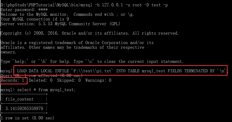 打开命令行,用MySQL monitor客户端(即MySQL.exe)连接上测试数据库,直接执行如下语句,将上述文件的内容记录到预先建立的mysql_test表内,注意在windows下路径中的反斜杠需要转义或改用斜杠:LOAD DATA LOCAL INFILE 'F:\\test\\pi.txt' INTOTABLE mysql_test FIELDS TERMINATED BY '\n';此时,指定的文件内容已经被记录到了表内,可以再执行select * from mysql_test;进行确认。