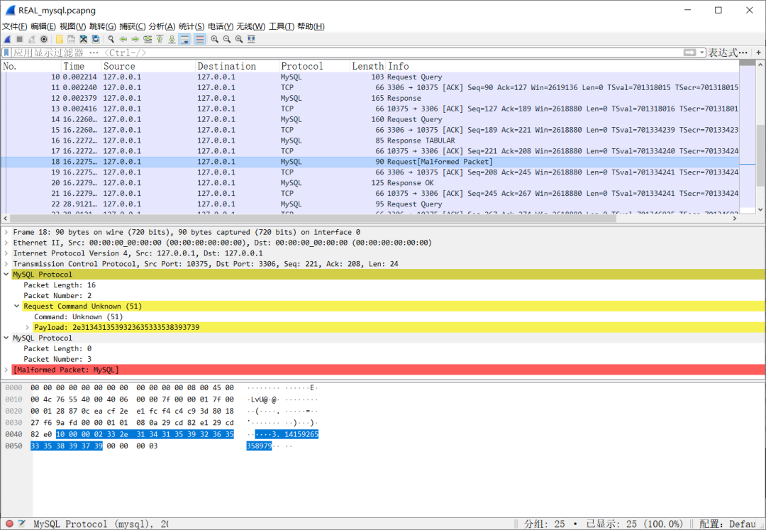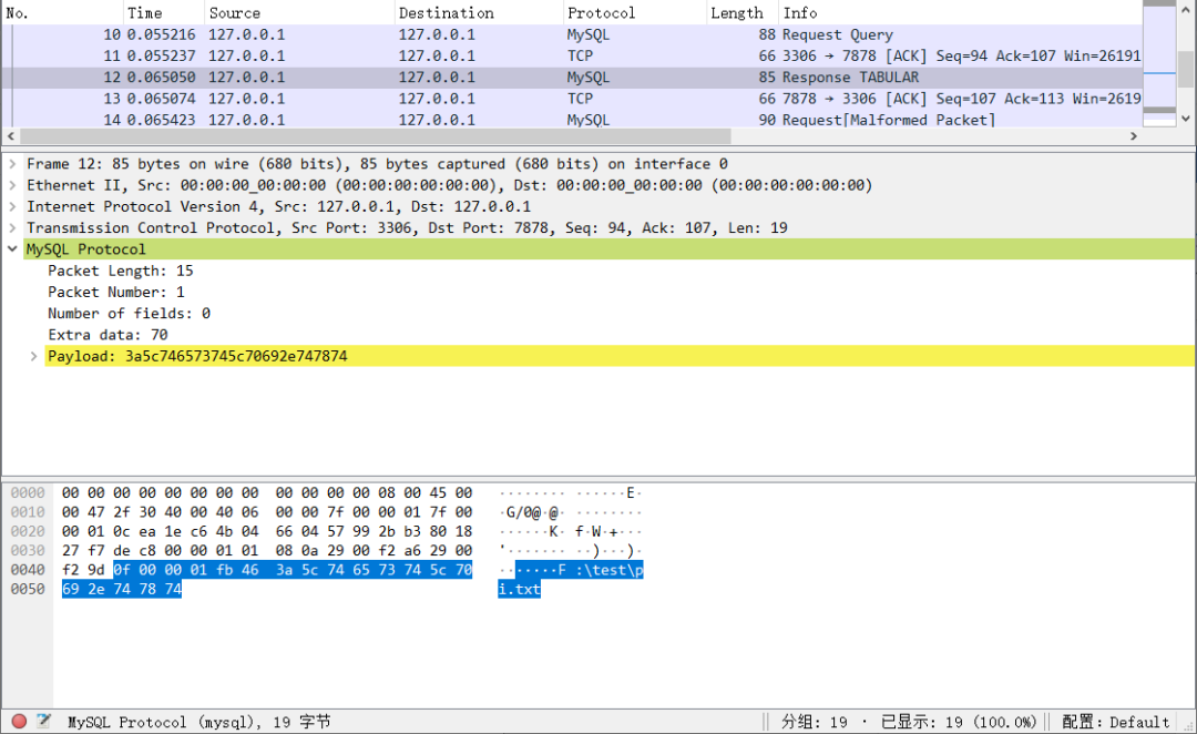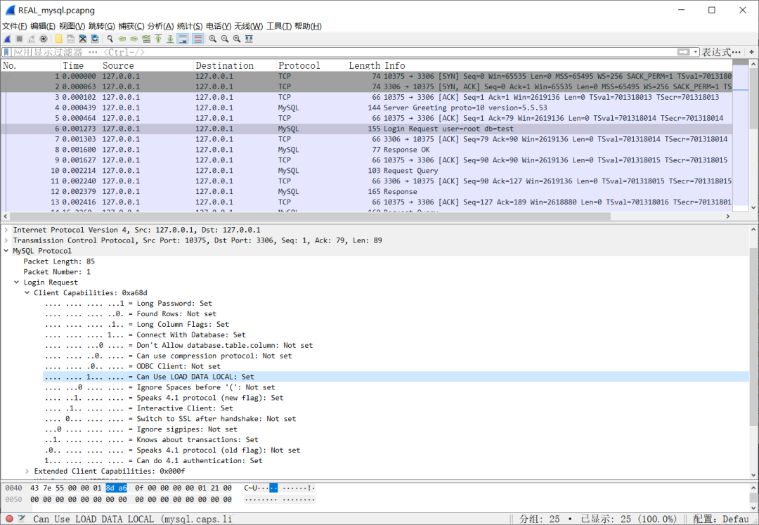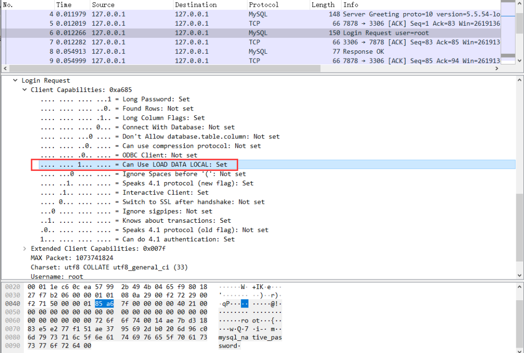 观察流量,可以看到此客户端在尝试连接MySQL服务端,发送登录请求时,默认将“Can Use LOAD DATA LOCAL”置为了1,相当于告诉了服务端,我(客户端)这里支持LOAD DATA LOCAL语句,可以读取客户端本地的文件内容,加载到服务端。