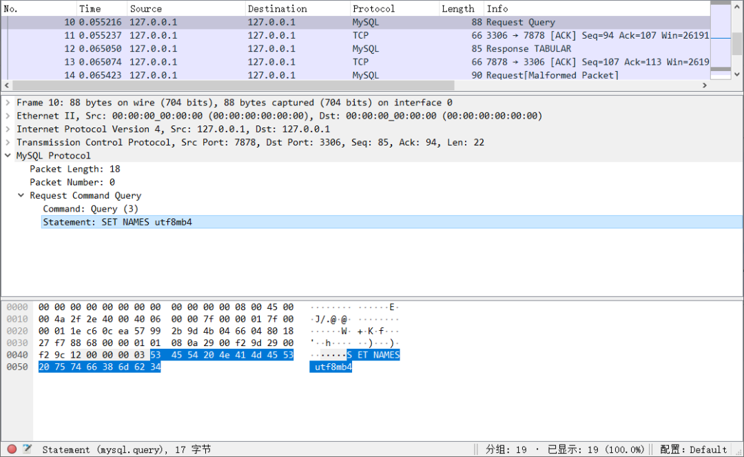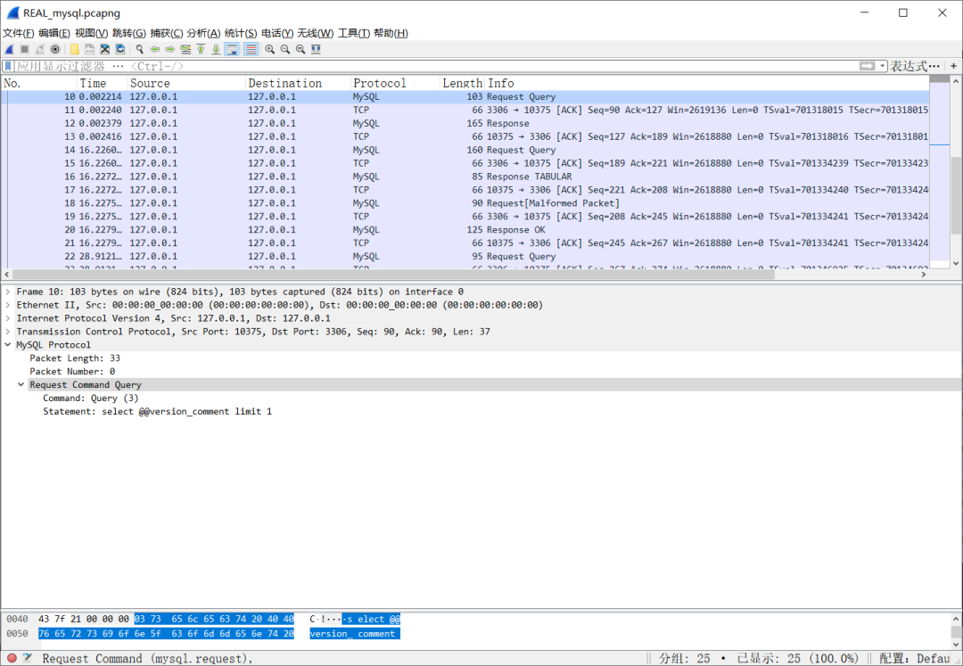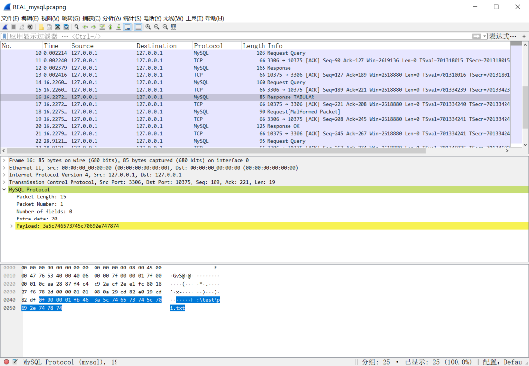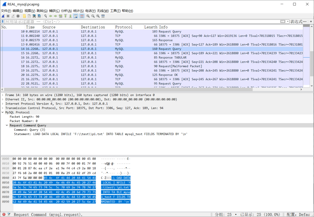 观察流量,可以看到此客户端在尝试连接MySQL服务端,发送登录请求时,默认将“Can Use LOAD DATA LOCAL”置为了1,相当于告诉了服务端,我(客户端)这里支持LOAD DATA LOCAL语句,可以读取客户端本地的文件内容,加载到服务端。