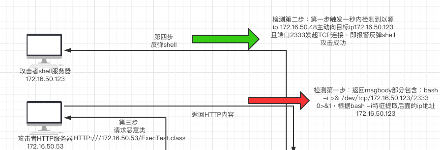上述的攻击行为也都是有特征可以做检测的,但是仅仅依据特征检测通常只能检测到探测攻击,每台流量检测设备每天的探测日志是海量的,安全运营人员很难从中获得价值信息。如果通过引擎关联上反弹shell的特征以及成功以后的后续动作即可去判断攻击成功服务器沦陷。以bash反弹shell为例: