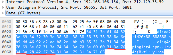 如果接收到其它节点的数据,发现了1:v4:(4byte flag),且flag满足上述算法,则认为对方是Mozi节点,继而和对方同步Config文件。如果没有,则认为是正常的DHT节点,按照标准的DHT协议回应。同样它自己发送给其它节点的数据也一定包含1:v4:(4byte flag)。Mozi运行后,按照标准DHT协议,首先向初始节点发送ping请求,来获取临近节点列表。