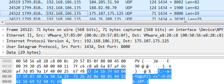 同样,如果一个Mozi节点想获取其它Mozi节点的Config数据,则向对方发送小于99字节的非DHT请求即可。它这儿只判断了长度,没判断数据内容,所以其实是随机的数据。下图即发送小于99字节的随机数据,长度也是随机的,有82,29不等,来获取对方的Config:
