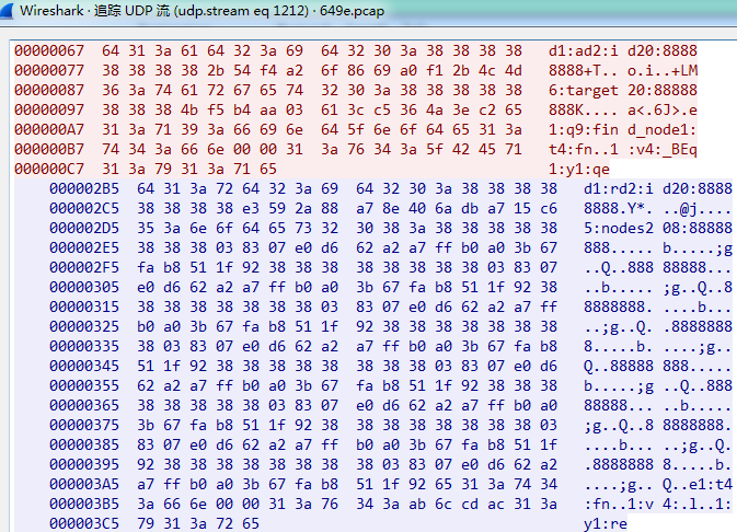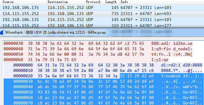 上图是向IP为114.15.155.252的Mozi节点发送了find_node请求之后,该节点判断请求来自Mozi节点,返回自身Config数据,即0x151529d2e6起始到结尾。随后继续发送find_node请求,这次114.15.155.252节点返回的是它自身临近的节点数据,即长度为277那一帧,见下图: