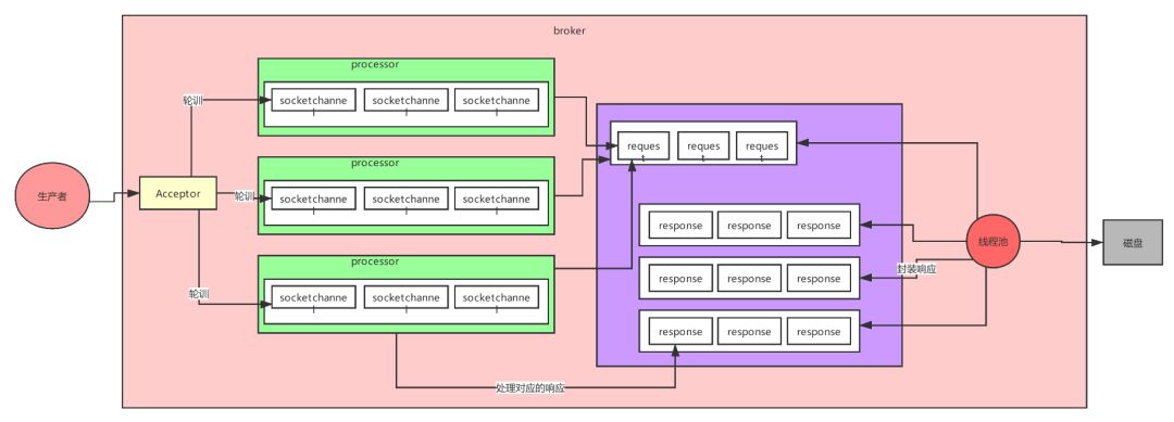 这 3 个线程都是叫做 Processor,Acceptor 不会对客户端的请求做任何的处理,直接封装成一个个 socketChannel 发送给这些 Processor 形成一个队列。