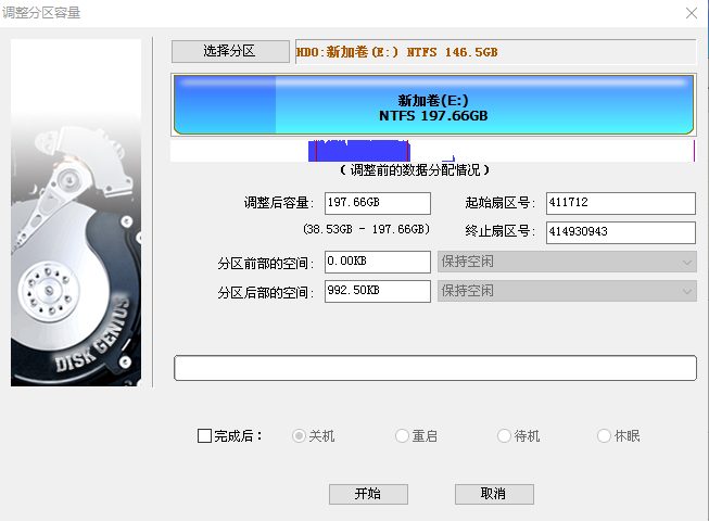 如下图所示,新加卷E盘空间现在变为197.66GB。点击开始。