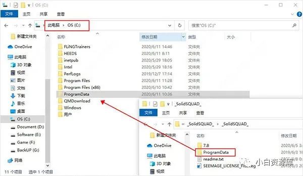 2、首先解压补丁_SolidSQUAD,将 "ProgramData" 文件夹复制到C盘根目录下;