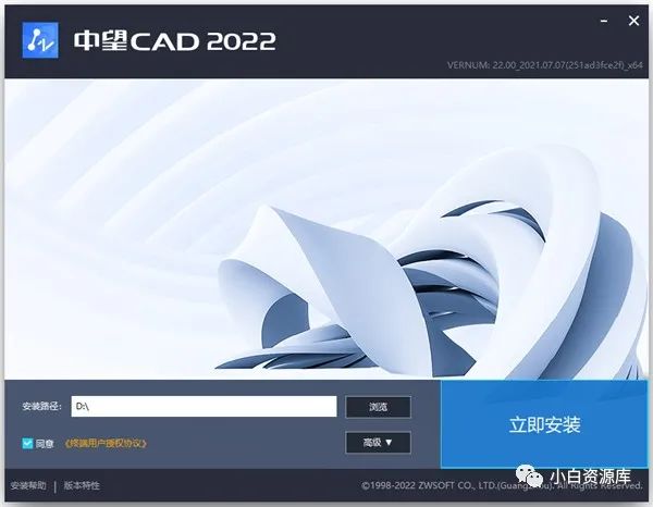 2、双击ZWCAD_2022_Chs_Win_64bit.exe,进入安装页面,勾选我同意相关许可协议,最后点击“立即安装”