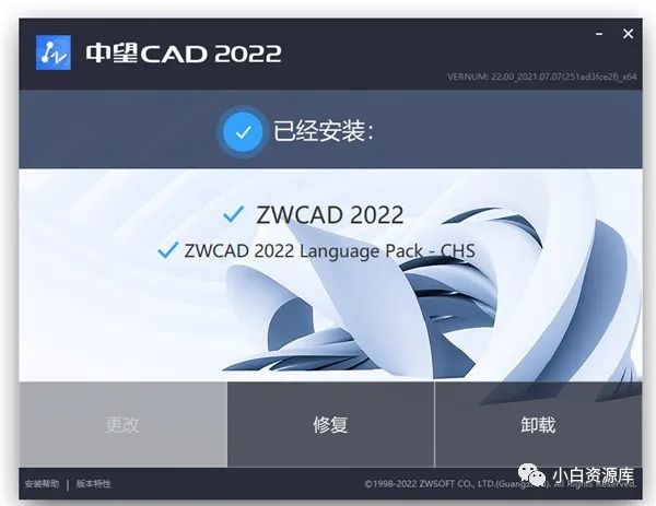 5、如果程序无法运行或者提示程序缺少dll,请再次运行数据包中的ZWCAD_2022_Chs_Win_64bit.exe安装程序,点击“修复”即可